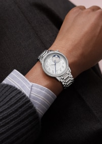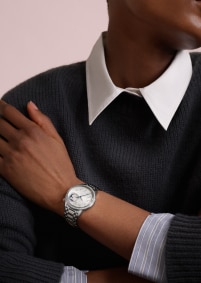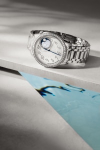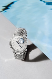This Haute Couture watch features a dial whose aesthetic recalls the delicate pleating of silk, obtained using the tapestry technique. The moon phase is illuminated by a ring between 1 and 2 o’clock adorned with 36 round-cut diamonds: two gold moons are revealed in turn on a starry sky, behind clouds of mother-of-pearl. Set with 58 round-cut diamonds and a cabochon moonstone, this steel watch is paired with a metal bracelet that curves around the wrist like a second skin.