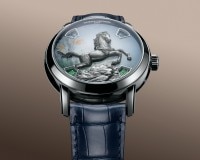 Dial description 18K gold dial with opaque miniature enamel. 18K gold relief hand-engraved appliques depicting a Horse leaping over a rocky base. Tone-on-tone discs indicating the hours, minutes, days and date.