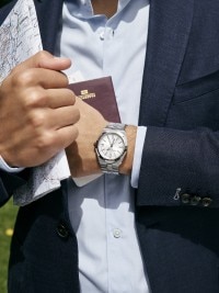 Perfectly suited to active lifestyles, this watch houses an automatic movement with an oscillating weight in 22K gold, inspired by the wind rose, a tribute to the spirit of travel. The bezel and steel bracelet subtly reveal the sides of the Maltese cross. Thanks to its clasp and system of three easily interchangeable straps – steel, leather, and rubber – the watch can be personalized according to the owner’s wishes.