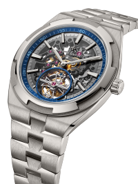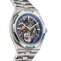 Dial description Sapphire dial with blue velvet-finished minutes track. Small seconds on tourbillon carriage. 18K gold applied hour/minute hands and hour-markers highlighted with blue SuperLuminova®.