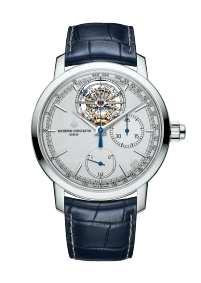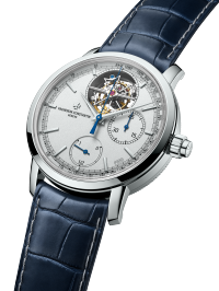 Dial description 950 platinum dial, sand-blasted. “Pt950” hallmark between 4 and 5 o’clock. Power-reserve indication at 6 o’clock and 45-minute chronograph counter at 3 o’clock. Small seconds on tourbillon carriage. Railway minute-track and tachymetric scale. 18K gold dauphine-style hour/minute hands. Blued chronograph hands, in steel for second hands and in 18K gold for minute and power reserve hands. 18K gold applied hour-markers.