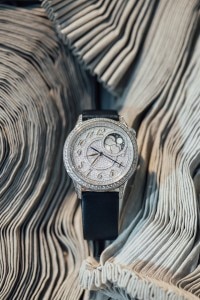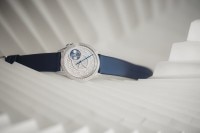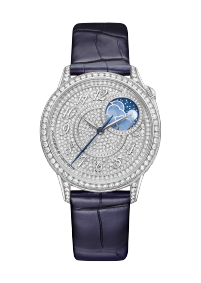 这款高级制表作品以高级定制时装为灵感,镶嵌845颗钻石,璀璨生辉。月相显示设于1点和2点位之间,两个珍珠贝母月亮在蓝宝石水晶云海后轮番显现,绽放迷人华彩。繁星满布的夜空与两条午夜蓝可替换表带互相呼应,表带分别采用缎面和鳄鱼皮材质,均设有镶钻标准表扣。