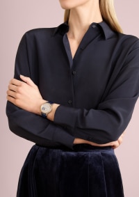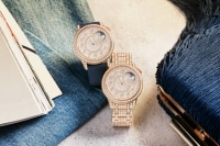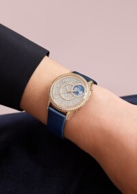 这款精美的5N 18K粉红金腕表灵感源自高级定制时装,镶嵌845颗圆形切割钻石,璀璨生辉。1点钟与2点钟位置之间的月相光芒闪耀,两枚珍珠母贝月亮在蓝宝石水晶云朵后轮番显现。腕表配以两条可替换表带,分别为缎面表带和鳄鱼皮表带,各搭配镶钻标准表扣,两条表带均采用夜蓝色调,令人想起繁星点点的夜空。