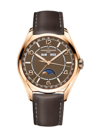 表盘描述 双层红棕色表盘:中央乳白色,旭日纹缎面打磨外圈。指针式日期、星期和月份视窗。18K金月亮,搭配蓝色夜空。18K金棒形时针/分针。18K金日期指针。18K金时标和阿拉伯数字。时针/分针及时标均覆有蓝色Super Luminova®夜光涂层。