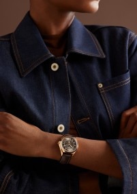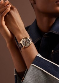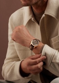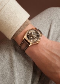 这款18K 5N粉红金腕表巧妙融合各种风格和时代的美学特征,配备全日历显示、日期指针以及星期和月份视窗,精准月相只需每122年调校一次。在蓝色天空背景的映衬下,18K 5N粉红金月相与墨棕色表盘相得益彰。优雅的棕色小牛皮表带淋漓展现Fiftysix伍陆之型系列的美学精髓。