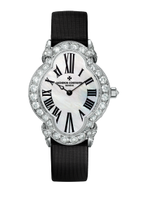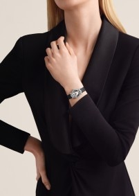 这款18K白金腕表的灵感源自1916年的经典表款,以丰富的花朵、自然和动物元素,致敬浪漫的美好年代(Belle Époque)和新艺术时期(Art Nouveau)。腕表镶嵌123颗圆形切割钻石,搭配珍珠贝母表盘,绘有罗马数字。Heure Romantique罗曼时光腕表配有皮革表带,以及采用镶钻折叠式表扣的缎面表带。