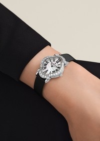 这款18K白金腕表的灵感源自1916年的经典表款,以丰富的花朵、自然和动物元素,致敬浪漫的美好年代(Belle Époque)和新艺术时期(Art Nouveau)。腕表镶嵌123颗圆形切割钻石,搭配珍珠贝母表盘,绘有罗马数字。Heure Romantique罗曼时光腕表配有皮革表带,以及采用镶钻折叠式表扣的缎面表带。