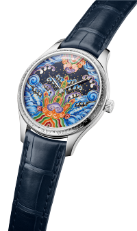 这款18K白金限量版腕表挥毫泼墨于“海水江崖纹”,这一极具象征意义的中国传统纹样巧妙结合波涛翻滚的海水与巍巍伫立的山崖,以此向博大精深的中国传统文化致以敬意。此作名为“浪涌乾坤”,表盘和摆陀饰以“海水江崖纹”,寓意一统山河、长治久安与万世升平,并熟练运用掐丝珐琅工艺令这一传统纹样得以生动呈现。而表圈上手工雕刻的蝙蝠图案更进一步映衬了“海水江崖纹”的深刻象征意义。自动上链机芯镌刻日内瓦印记,象征卓越品质和可靠性能。