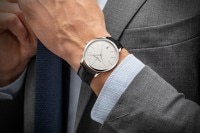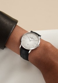 这款18K白金腕表简约优雅,是经典隽永的杰作。时标和指针的灵感源于1950年代的设计风格,与表盘的细腻线条相得益彰。日期视窗位于6时位置,精致简约。透过腕表的镂雕底盖,可欣赏灵感源自马耳他十字造型的22K金摆陀。