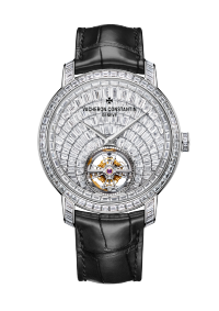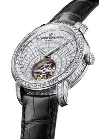 这款Traditionnelle传袭系列18K白金腕表搭载2160型超薄自动上链机芯,巧妙结合了高级珠宝与高级制表领域的精湛工艺。透过6点钟位置的表盘开口,清晰可见配备陀飞轮调节装置的机芯,采用22K金质边缘式摆陀为机芯上链,确保动力储存超过3天。隐秘式镶嵌工艺则将钻石镶嵌艺术的璀璨美感呈现得淋漓尽致:表盘全铺镶158颗长方形切割钻石,表壳镶嵌160颗长方形切割钻石。