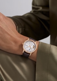这款18K 5N粉红金腕表镶嵌81颗圆形切割钻石,配备精密月相显示,位于珍珠贝母表盘的中央,繁星满布的夜空,与鳄鱼皮表带的色彩巧妙搭配,彰显别致美感。此复杂功能饶富诗意,只需每122年调校一次。透过腕表的透明底盖,手动上链机械机芯的细致装饰一览无余。